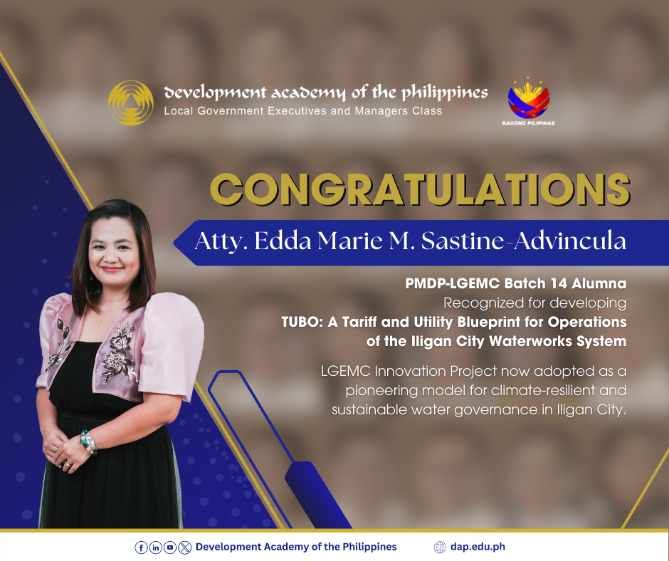 The Development Academy of the Philippines extends its warmest congratulations to Atty. Edda Marie M. Sastine-Advincula for translating her LGEMC innovation project into meaningful, real-world outcomes. Her work stands as an inspiring example of how empowered local leaders can drive sustainable and future-ready communities. The PMDP-LGEMC is immensely proud of her achievement!