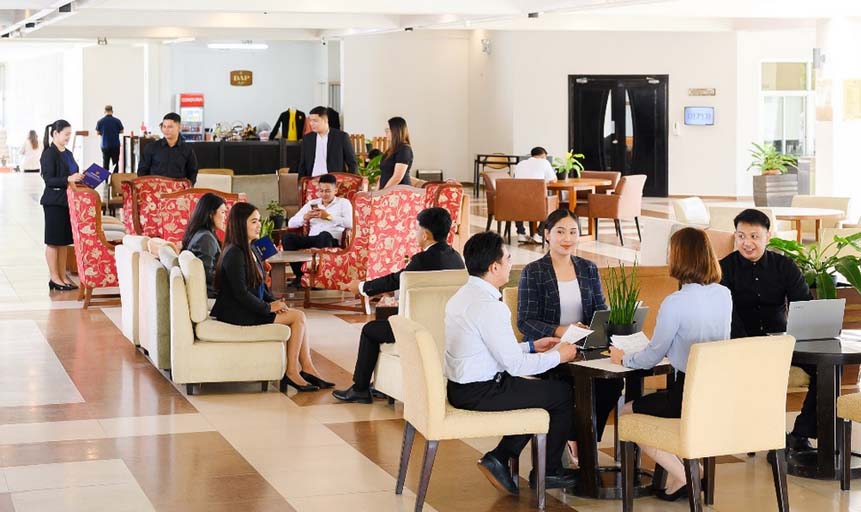 The Multi-level Conference Room, with a floor area of 154 sqm, is a fully equipped, air-conditioned function room that can accommodate up to 63 participants. It features a sound system, an LCD projector with screen, and a whiteboard. The room is also equipped to support online streaming platforms such as Zoom, YouTube, and Facebook Live, using modern equipment like DSLR cameras, digital video cameras, and video mixers.