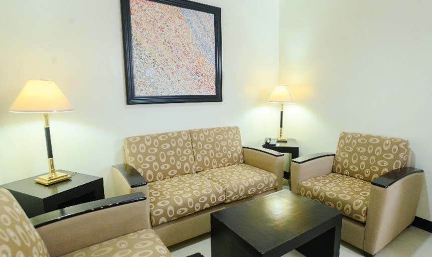 The DAPCC Suite Room, with a floor area of 354.75 sqm, can accommodate two to three persons. It features a fully air-conditioned space, a separate seating area with a sofa and coffee table, a 32-inch Smart TV, a refrigerator, and a private toilet and bath.